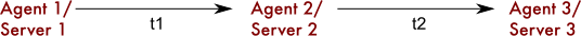 For example, in the following scenario, you see a 3-server architecture where a Beat is installed on each server. t1 is the transaction exchanged between Server1 and Server2, and t2 is the transaction between Server2 and Server3.