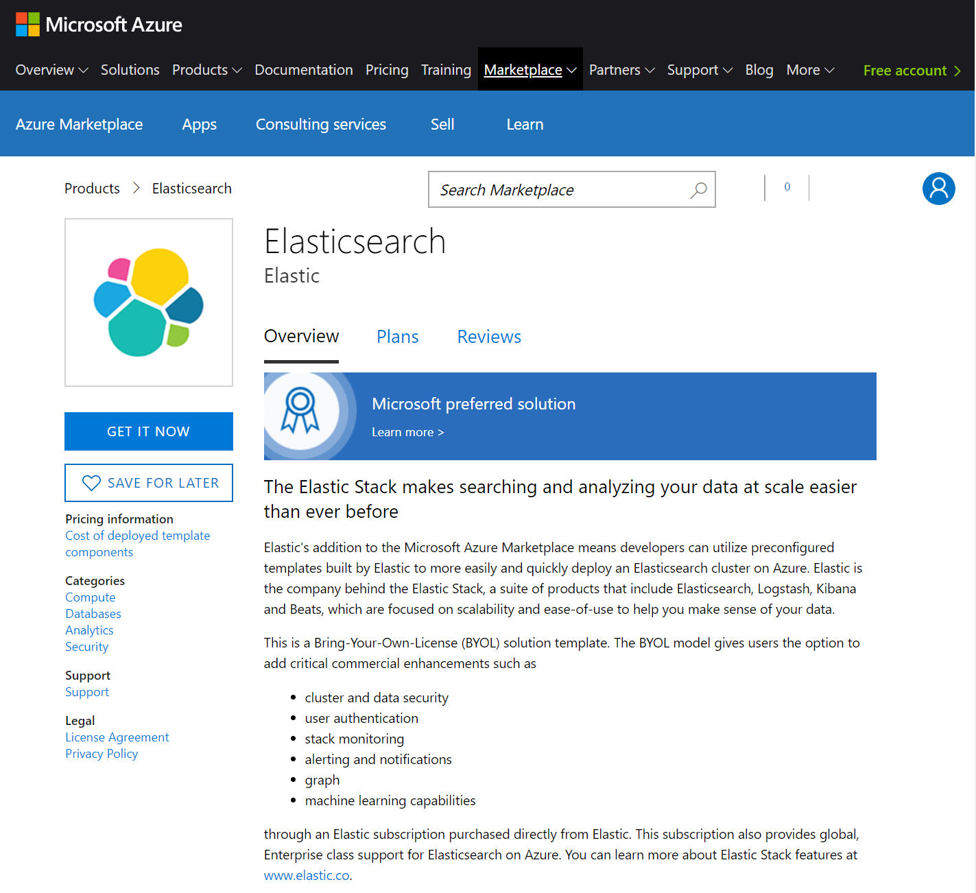 The Azure Marketplace and Resource Manager (ARM) template has reached its end of life. Instead, customers are strongly advised to use our newer Elastic Cloud (Elasticsearch Service) offering in the Azure Marketplace. To learn more, refer to the Native Azure integration documentation.