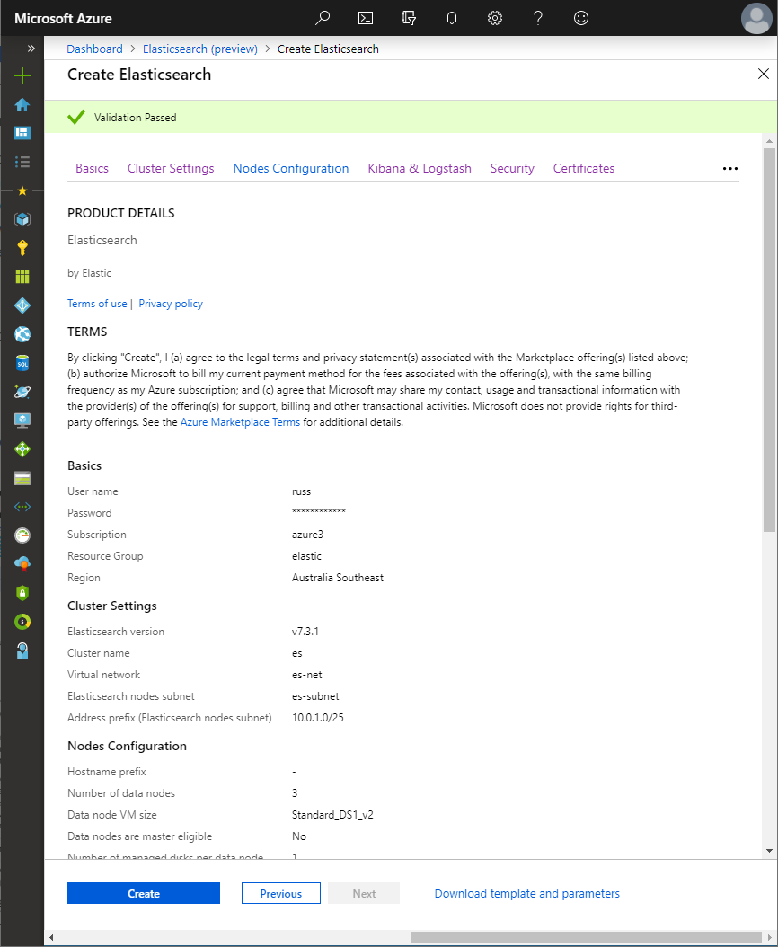 The Azure infrastructure also performs some final validation steps. Once you’re happy to proceed and the OK button is clicked, a new deployment will be started and within minutes, you’ll have Elasticsearch running on Azure!