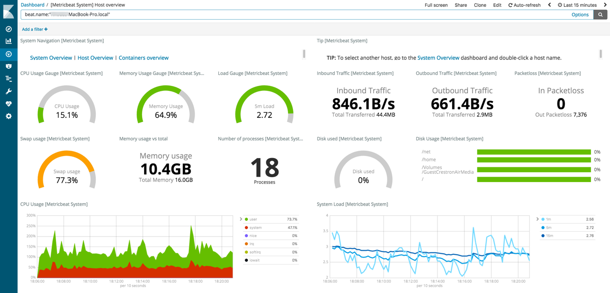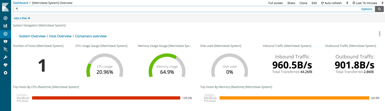 editTo visualize system metrics, open your browser and navigate to the Metricbeat system overview dashboard: http://localhost:5601/app/kibana#/dashboard/Metricbeat-system-overview-ecs