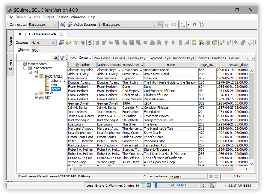 editYou can use the Elasticsearch JDBC driver to access Elasticsearch data from SQuirreL SQL.