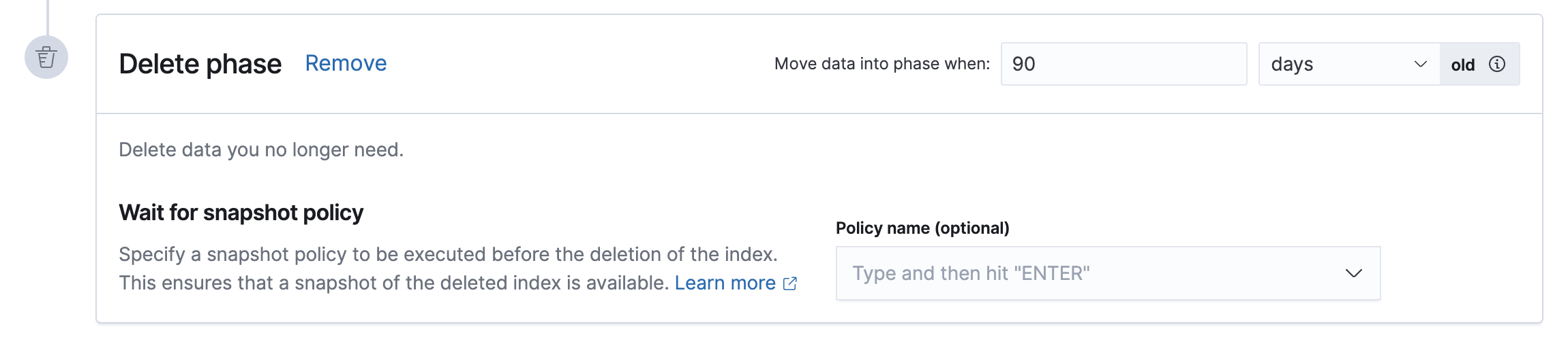 In the delete phase, set Move data into phase when to 90 days old. This deletes indices 90 days after rollover.