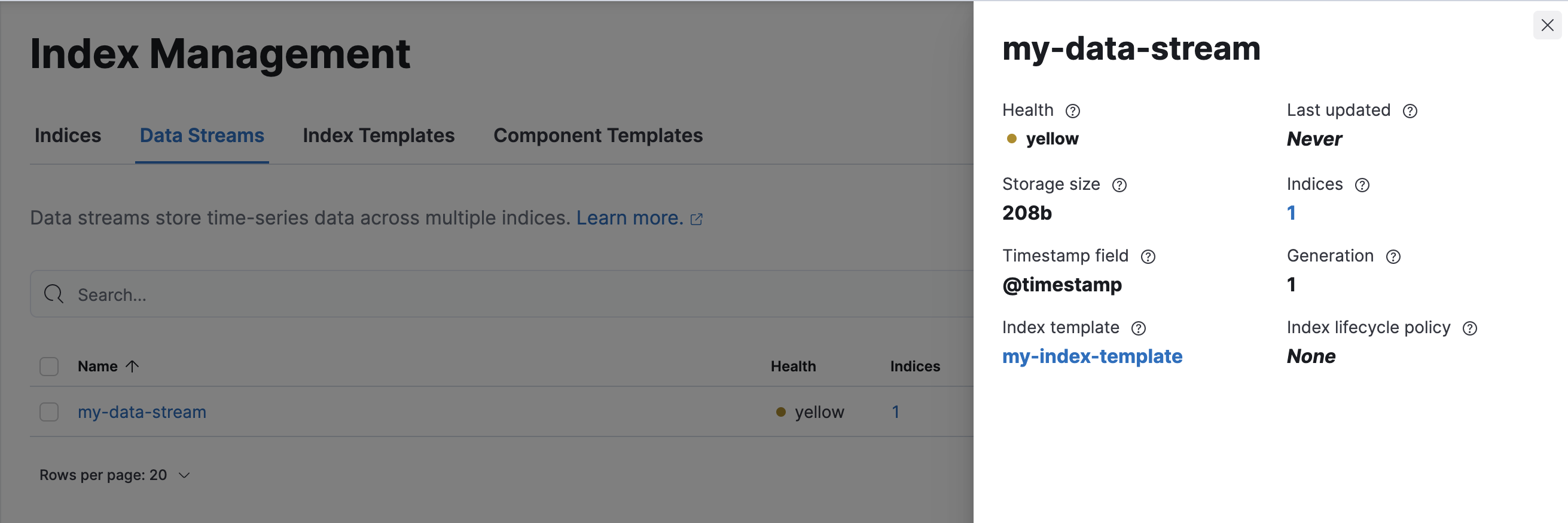 To view information about the stream’s backing indices, click the number in the Indices column.