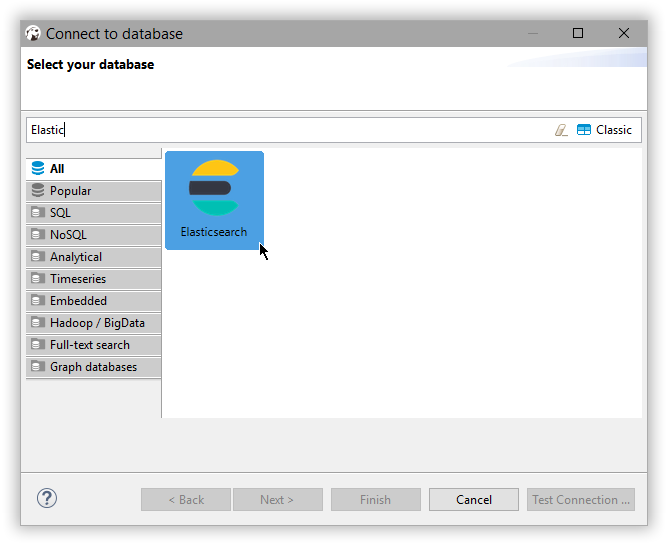 Click Finish and the new Elasticsearch connection appears in the Database Connection panel.