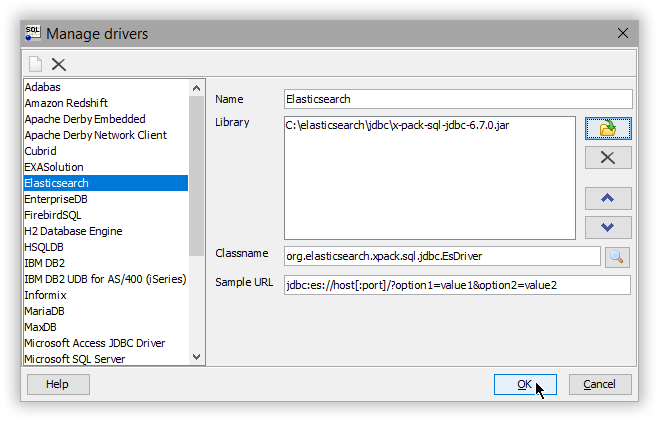 Add the Elasticsearch JDBC driver to SQL Workbench/J through Manage Drivers either from the main windows in the File menu or from the Connect window: