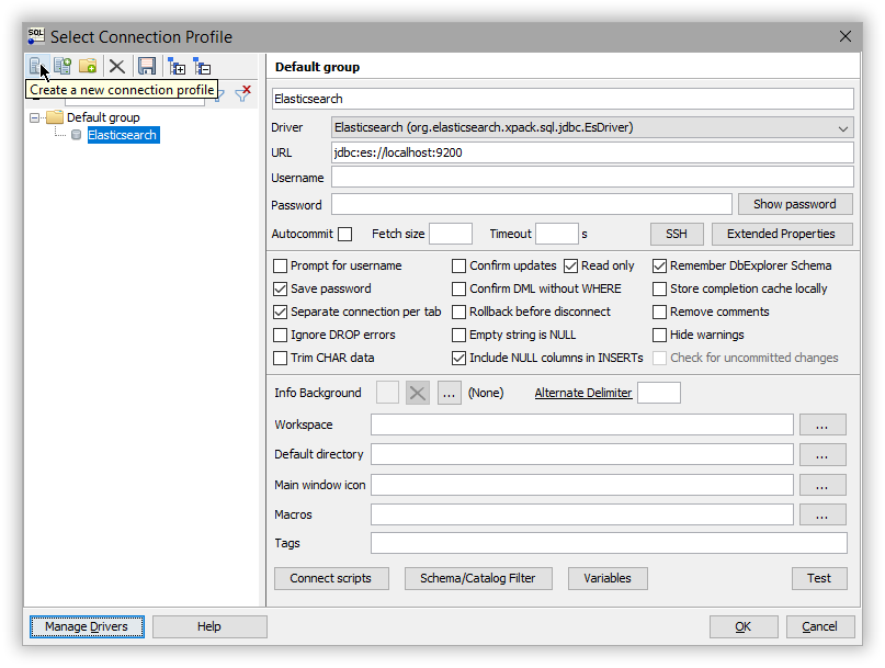 Select Elasticsearch profile from the left-hand side (if it is missing check the SQL Workbench/J version or add a new entry to the list through the blank page button in the upper left corner):
