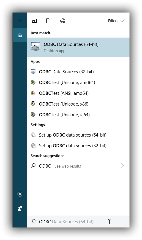 To launch it, open the search menu - Win + S - and type "ODBC Data Sources (64-bit)" or "ODBC Data Sources (32-bit)" and press Enter: