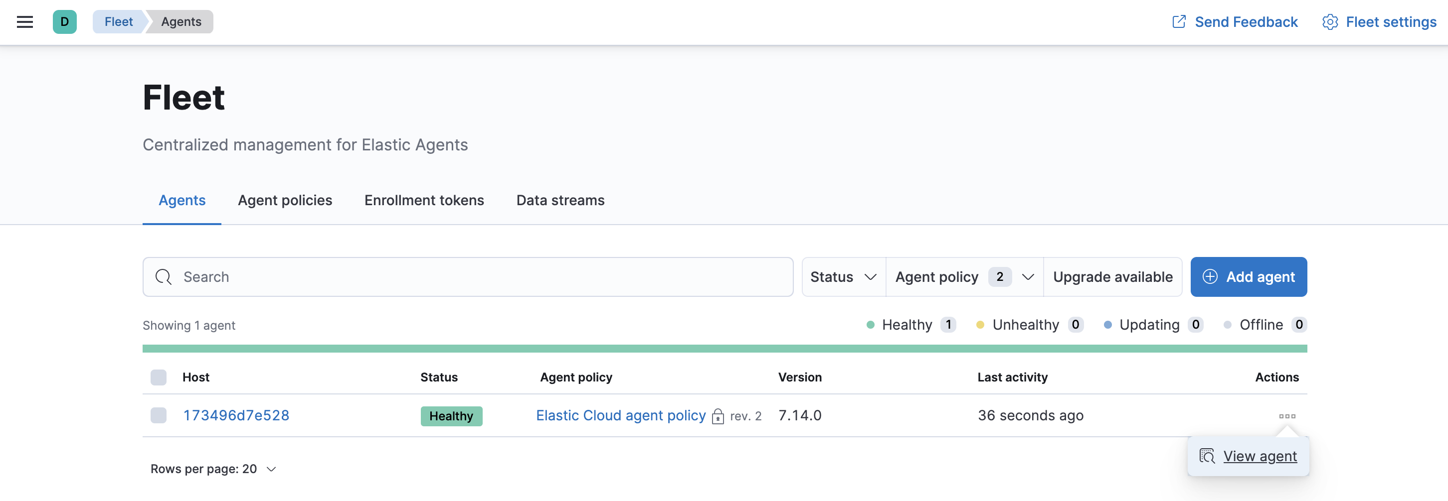 editYou can see the state of all your Elastic Agents in Fleet. On the Agents page, you can see which agents are online, which have errors, and the last time they checked in. You can also see the version of the Elastic Agent binary and policy.