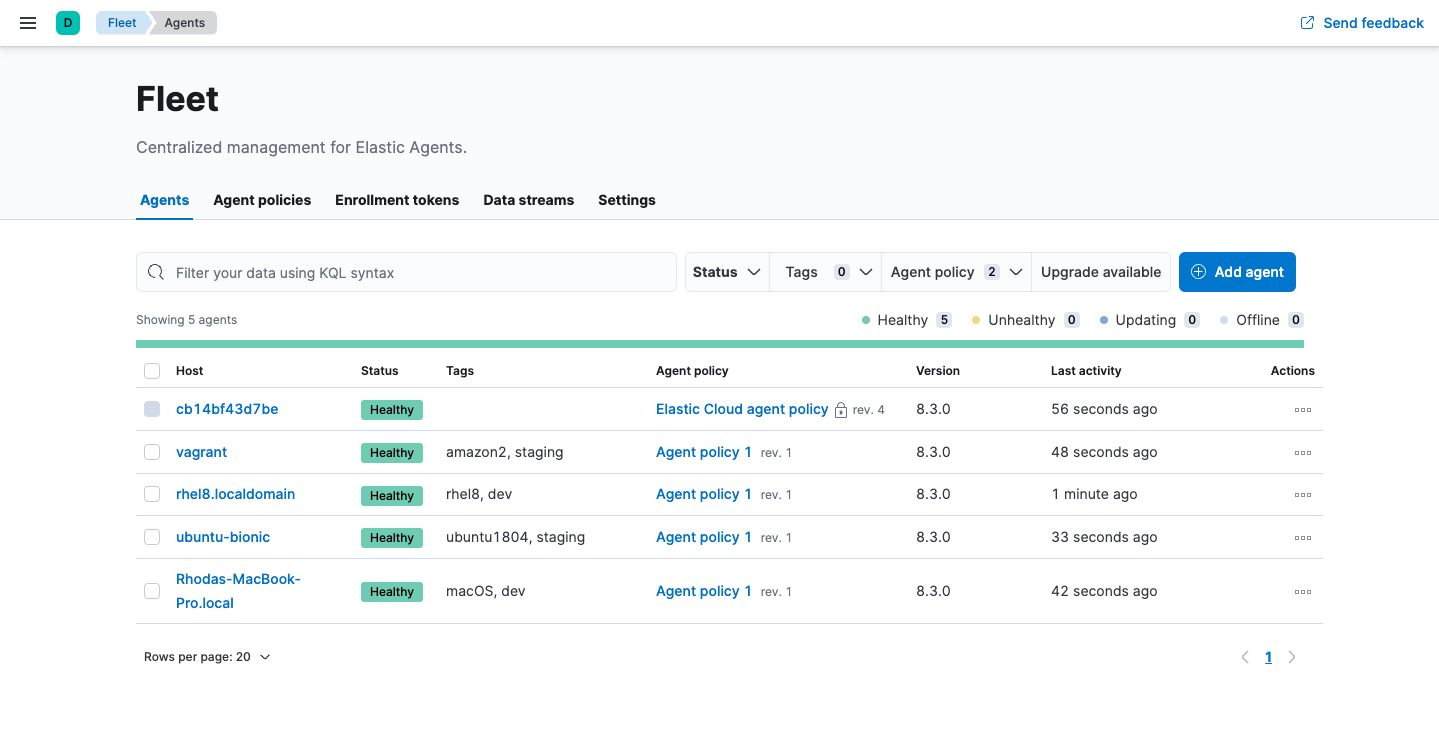 To confirm that Elastic Agent is installed and running, go to the Agents tab in Fleet.