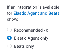 Scroll down and select Elastic Agent only so the view shows integrations that work with Elastic Agent.