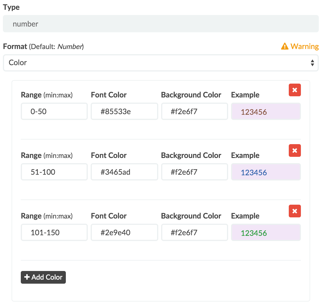 The Color field formatter enables you to specify colors with specific ranges of values for a numeric field.