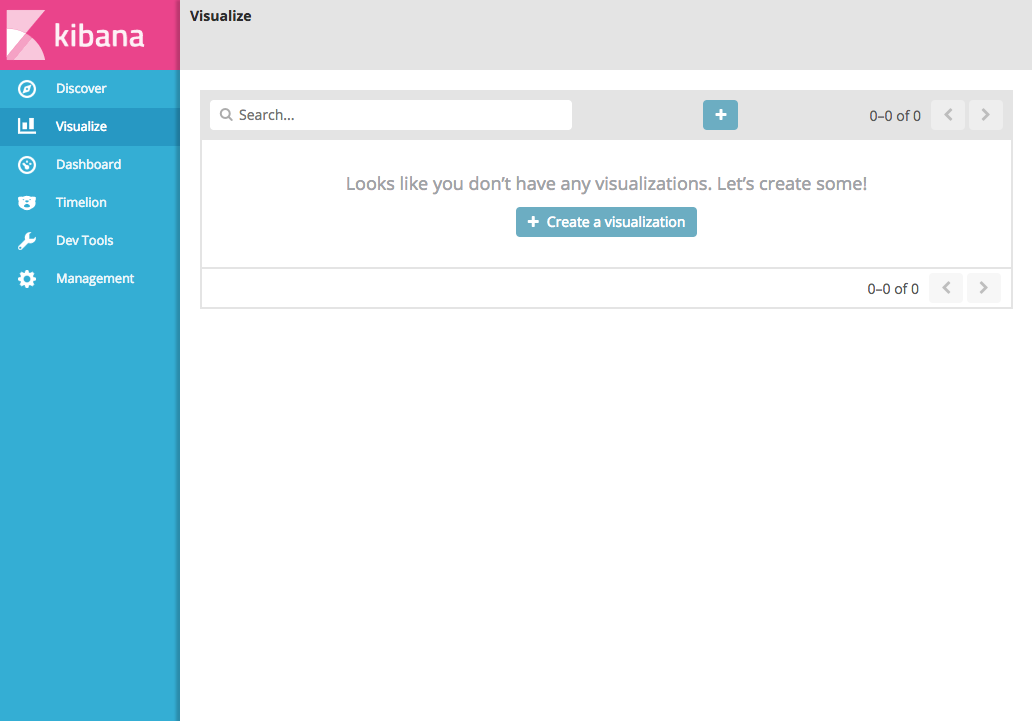 The Visualize tools enable you to view your data in several ways. For example, let’s use that venerable visualization, the pie chart, to get some insight into the account balances in the sample bank account data. To get started, click the big blue Create a visualization button in the center of the screen.