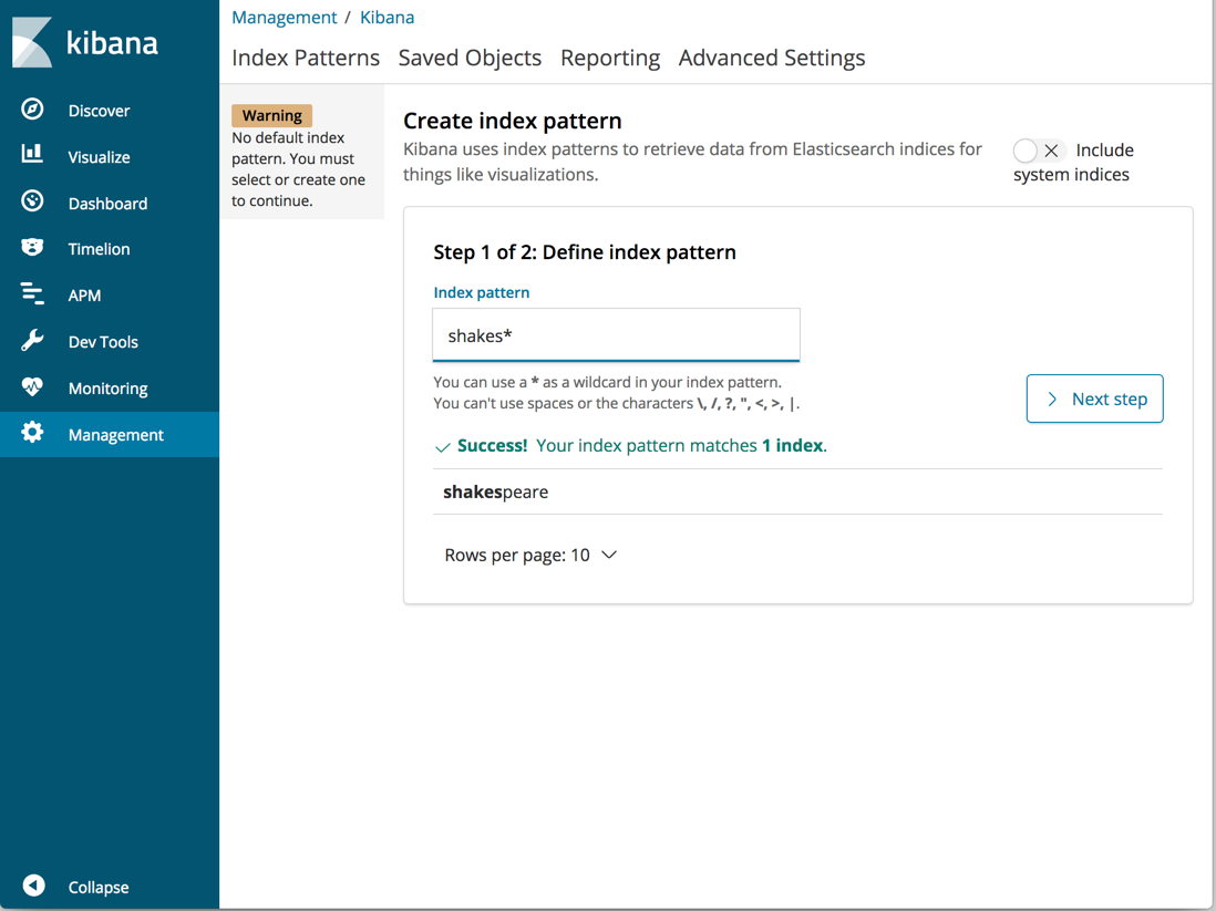 shakes*in the Index pattern field.