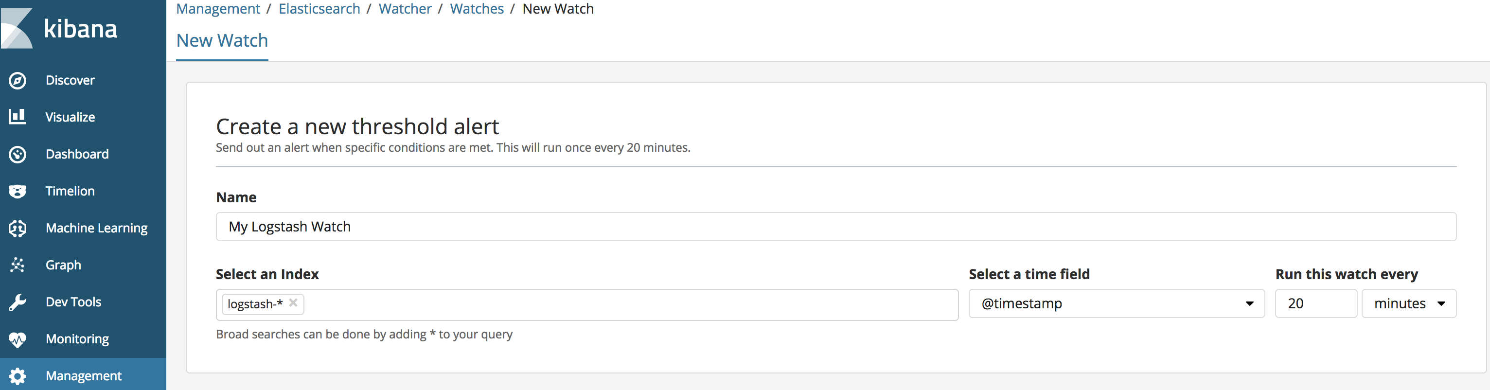 You can create a threshold alert to periodically check when your data goes above or below a certain threshold within a given time interval. It’s one of the most common type of alerts that you can create using Watcher. For more advanced watches, see the Create Advanced Watch.