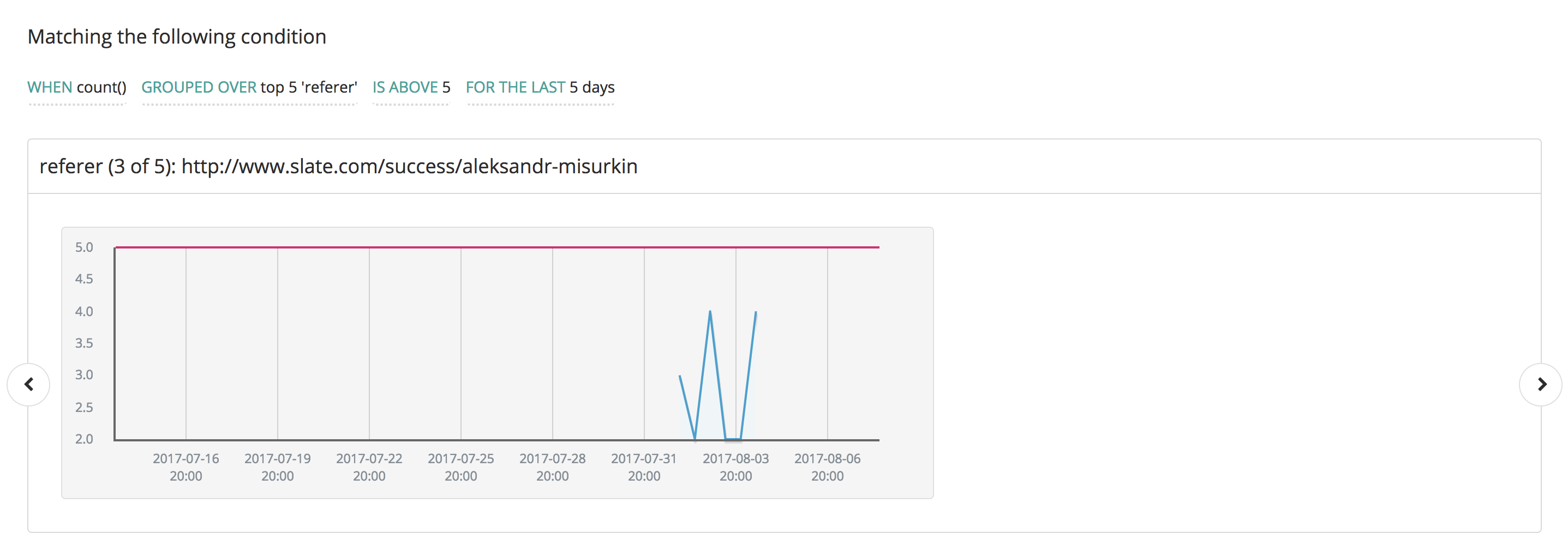 • In the chart, you will see a blue line that represents the aggregated data. There is also a red line that represents the threshold value.