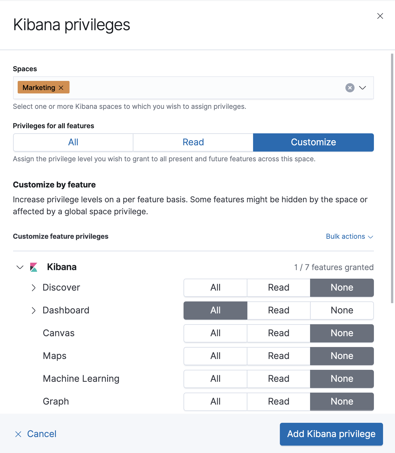 - Click Add Kibana privilege.