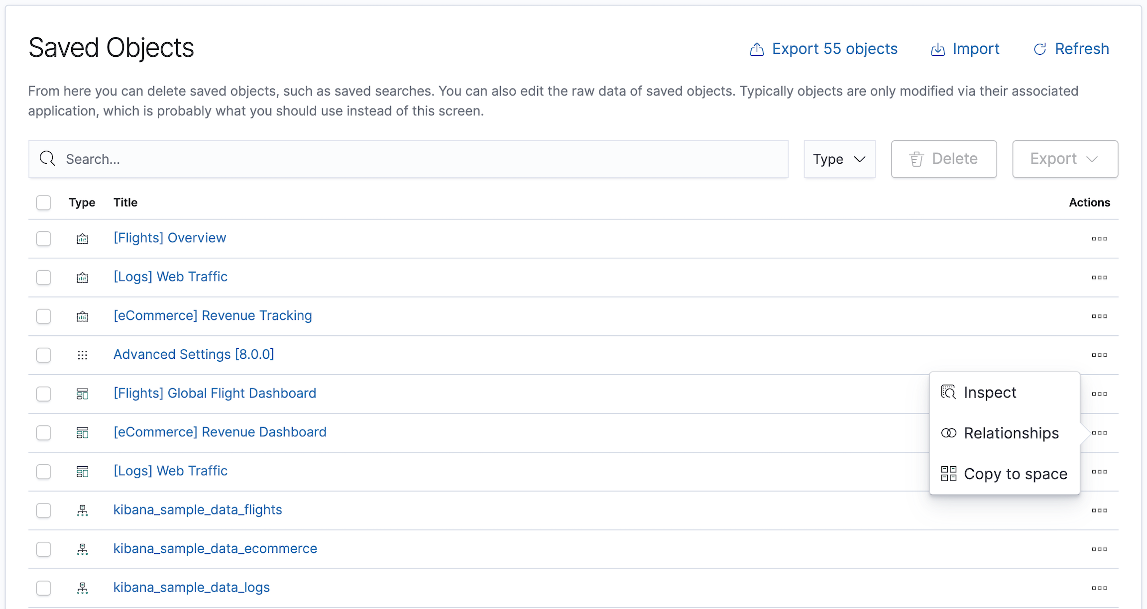 editUsing the import and export commands, you can move objects between different Kibana instances. This action is useful when you have multiple environments for development and production. Import and export also work well when you have a large number of objects to update and want to batch the process.