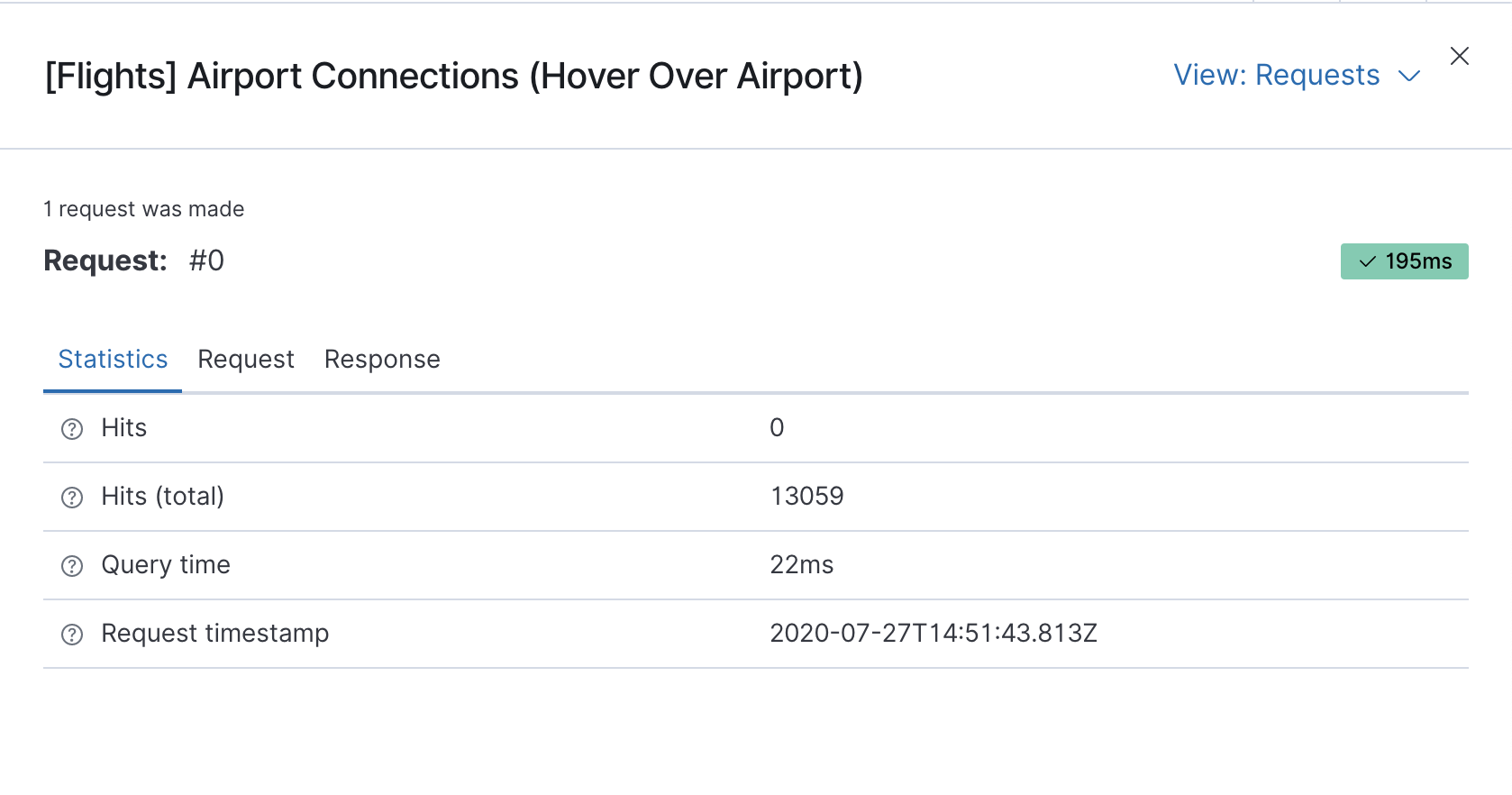editVega uses the Elasticsearch search API to get documents and aggregation results from Elasticsearch. To troubleshoot these requests, click Inspect, which shows the most recent requests. In case your specification has more than one request, you can switch between the views using the View dropdown.