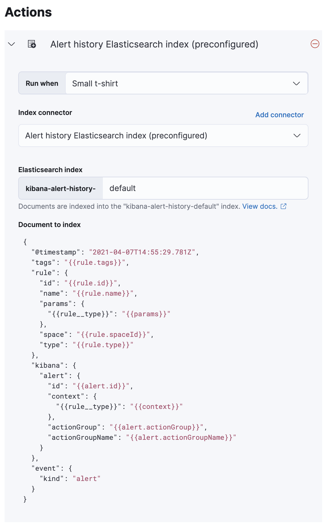 Documents are indexed using a preconfigured schema that captures the action variables available for the rule. By default, these documents are indexed into the kibana-alert-history-default index, but you can specify a different index. Index names must start with kibana-alert-history- to take advantage of the preconfigured alert history index template.