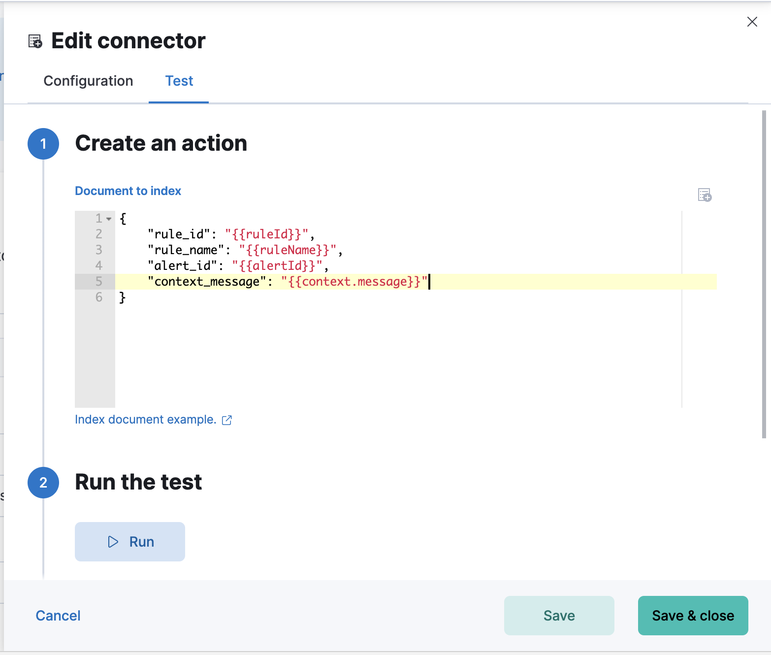 editThe index connector will index a document into Elasticsearch. See also the create index API.