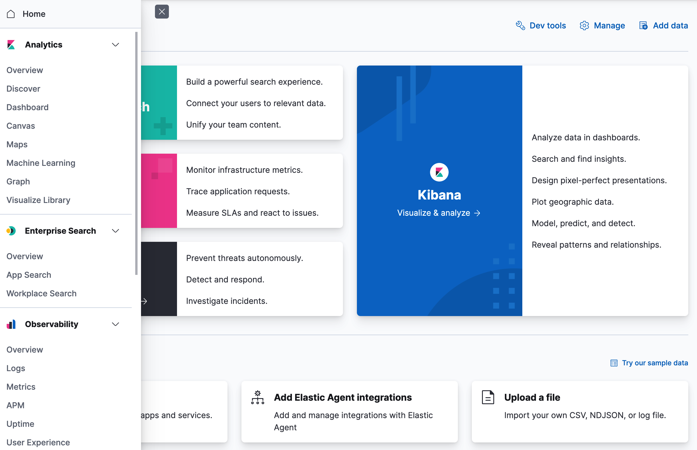The home page provides access to the Enterprise Search, Observability, and Security solutions, and everything you need to visualize and analyze your data.