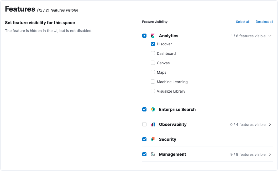 editYou can take spaces one step further and control which features are visible within each space. For example, you might hide Dev Tools in your "Marketing" space or show Stack Monitoring only in your "Engineering" space.