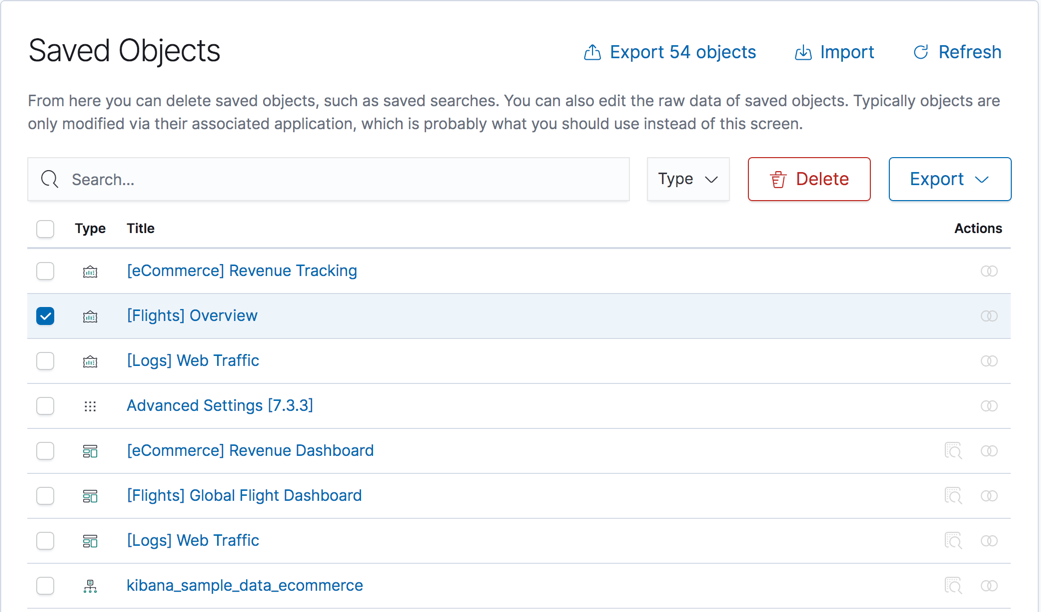 To get started, go to Management > Kibana > Saved Objects. With this UI, you can: