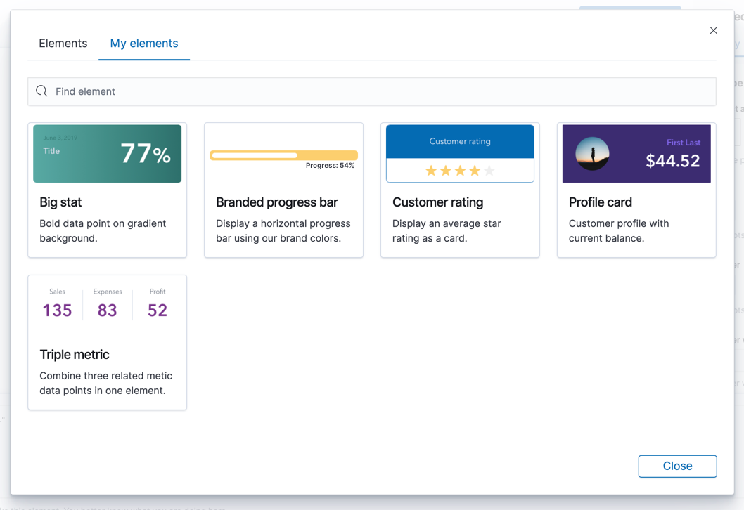editElements, such as charts, metrics, shapes, and images, are the building blocks of a Canvas workpad. You can combine these elements to create new and interesting presentations of your data. Your custom element might be as simple as a metric on top of a geometric shape. Or, you might create a more complex grouping backed by queries and conditional statements.