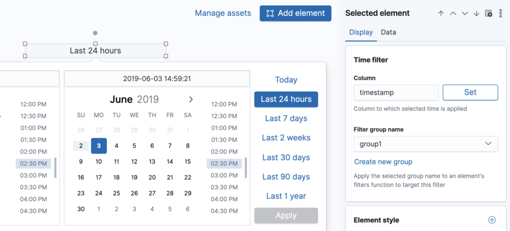 editIf you’ve used the time or dropdown filter elements in Canvas, you know that they apply to the entire workpad (and not just the page they are in). This behavior is still the default, but you can now choose which elements are affected by specific filters. This gives you more options for exploring data visualizations.