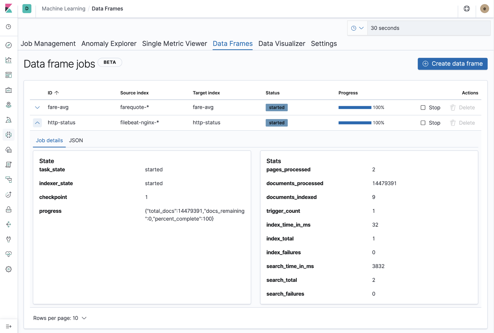 edit[beta] This functionality is in beta and is subject to change. The design and code is less mature than official GA features and is being provided as-is with no warranties. Beta features are not subject to the support SLA of official GA features. Machine Learning now enables you to transform your data with data frames. A new wizard guides you through the process of creating a data frame: selecting the source data, the fields you want to group by, and the aggregations for pivoting the data. There is also a preview of the transform for reviewing the configuration.