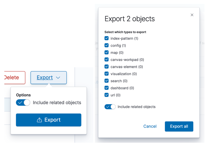 editKibana has new APIs for importing and exporting saved objects, including dashboards, visualizations, index patterns, maps, Canvas workpads, and advanced settings. A benefit of this new API is that it automatically exports the dependencies of the saved object. Just export the dashboard you need and its visualizations and index patterns are exported as well. You can use the new APIs in the Management UI, or call them directly.
