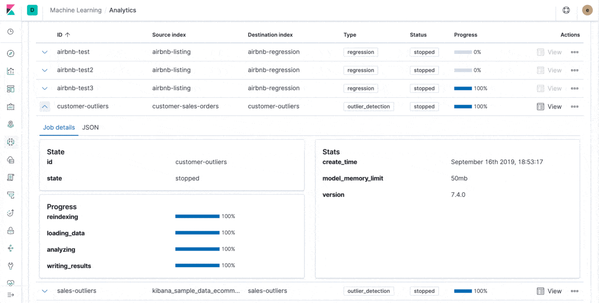 edit[preview] This functionality is in technical preview and may be changed or removed in a future release. Elastic will work to fix any issues, but features in technical preview are not subject to the support SLA of official GA features. In 7.3, Kibana added an API that provided outlier detection analysis. In this release, Kibana has a new view in Machine Learning where you can create, manage, and view your outlier detection jobs and their results. Because the results are just another index, you can create some insightful visualizations and maps based on the outliers found in your entity-centric data.