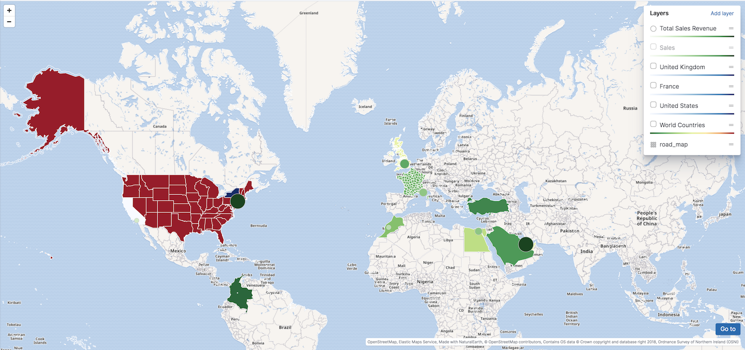 editYou can use multiple layers and indices to show all your data in a single map. This enables your map to show how data sits relative to physical features like weather patterns, human-made features like international borders, and business-specific features like sales regions. You can plot individual documents or use aggregations to plot any data set, no matter how large.