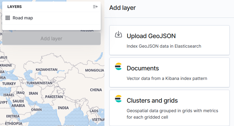editTo visualize geospatial data in a point or shape file, you can upload it using the GeoJSON Upload feature in Maps, and then use that data as a layer in a map. The data is also available for use in the broader Kibana ecosystem, for example, in visualizations and Canvas workpads. With GeoJSON Upload, you can upload a file up to 50 MB.