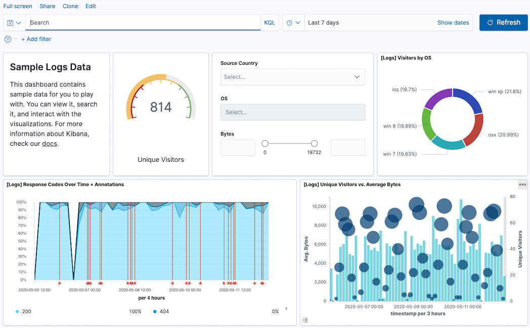 Once your visualizations are just the way you want, use Dashboard to collect them in one place. A dashboard provides insights into your data from multiple perspectives.