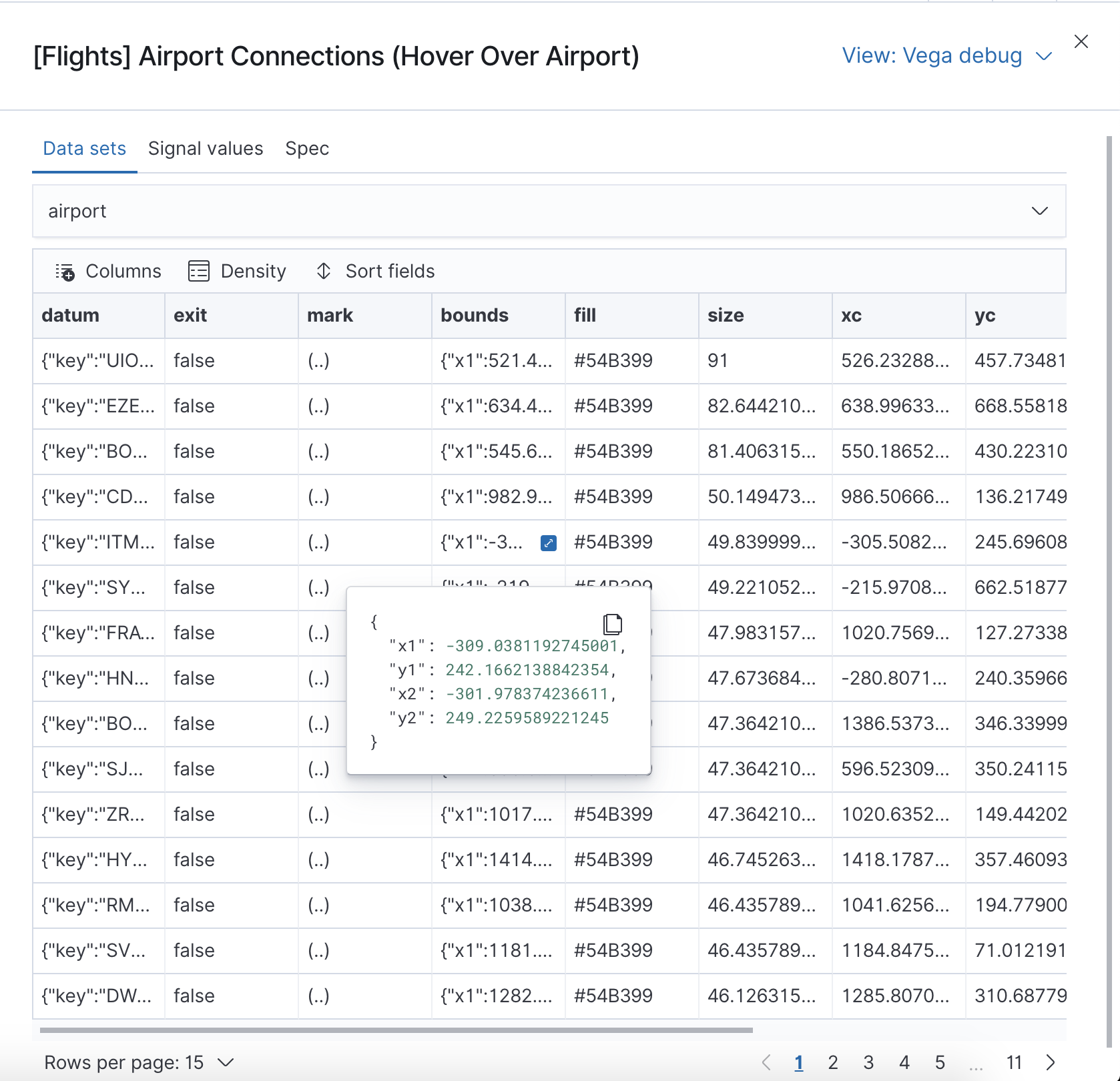 editBecause of the dynamic nature of the data in Elasticsearch, it is hard to help you with Vega specs unless you can share a dataset. To do this, click Inspect, select the Vega debug view, then select Spec.