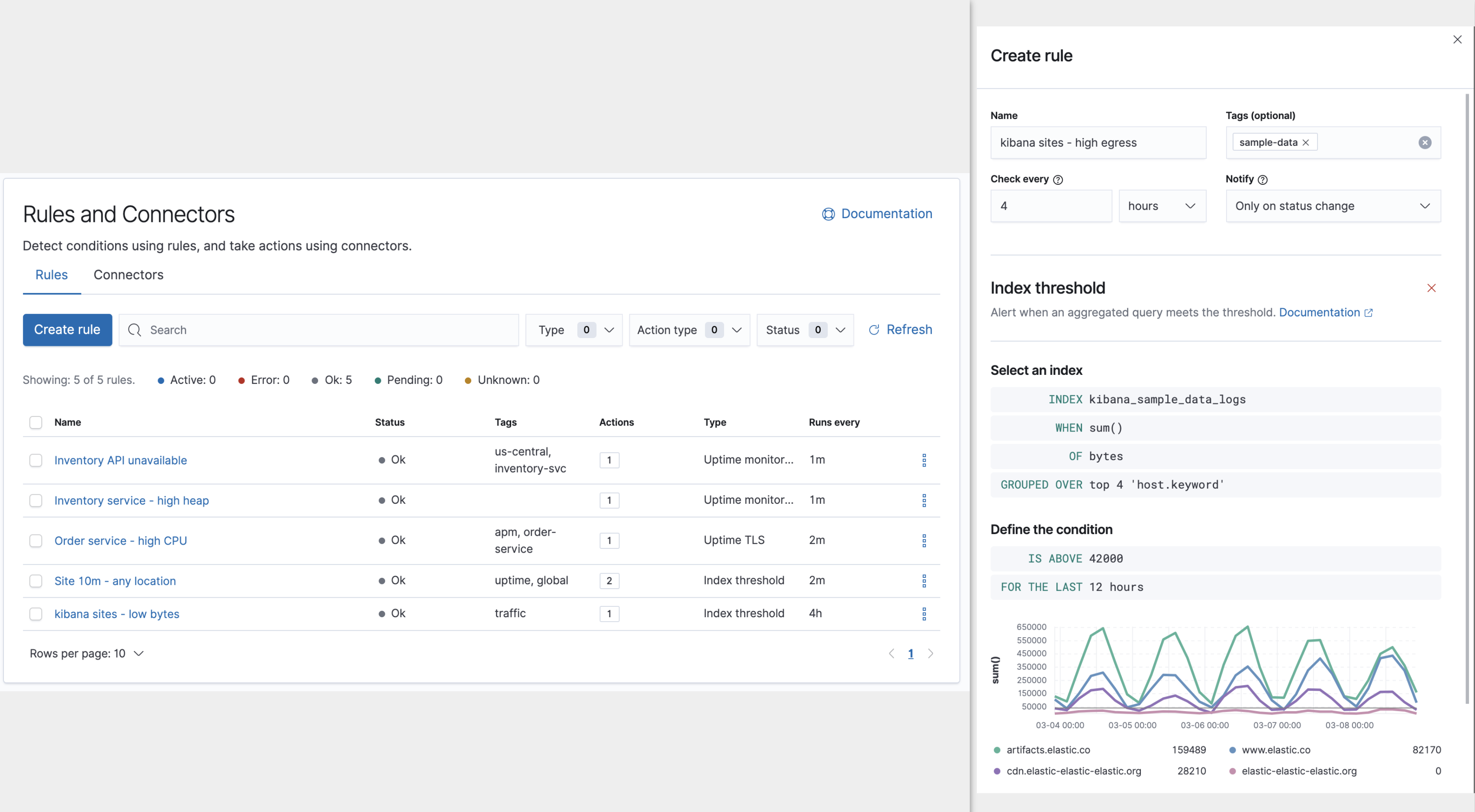 editAlerting allows you to define rules to detect complex conditions within different Kibana apps and trigger actions when those conditions are met. Alerting is integrated with Observability, Security, Maps and Machine Learning, can be centrally managed from the Management UI, and provides a set of built-in connectors and rules (known as stack rules) for you to use.