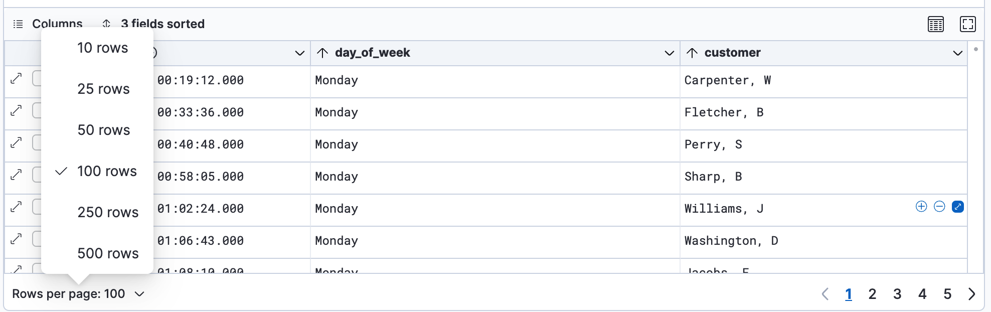 To change the numbers of rows you want to display on each page, use the Rows per page menu. The default is 100 rows per page.