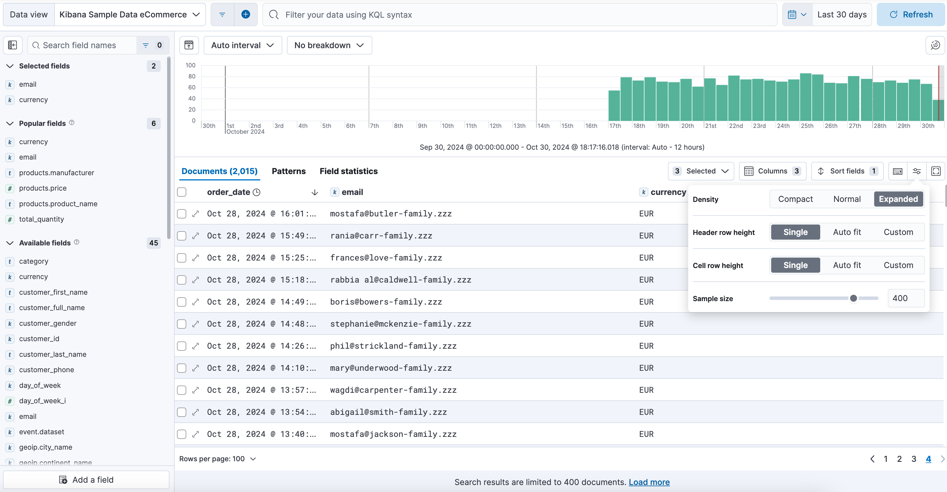 editWhen the number of results returned by your search query (displayed at the top of the Documents or Results tab) is greater than the value of discover:sampleSize, the number of results displayed in the table is limited to the configured value by default. You can adjust the initial sample size for searches to any number between 10 and discover:sampleSize from the Display options located in the table toolbar.