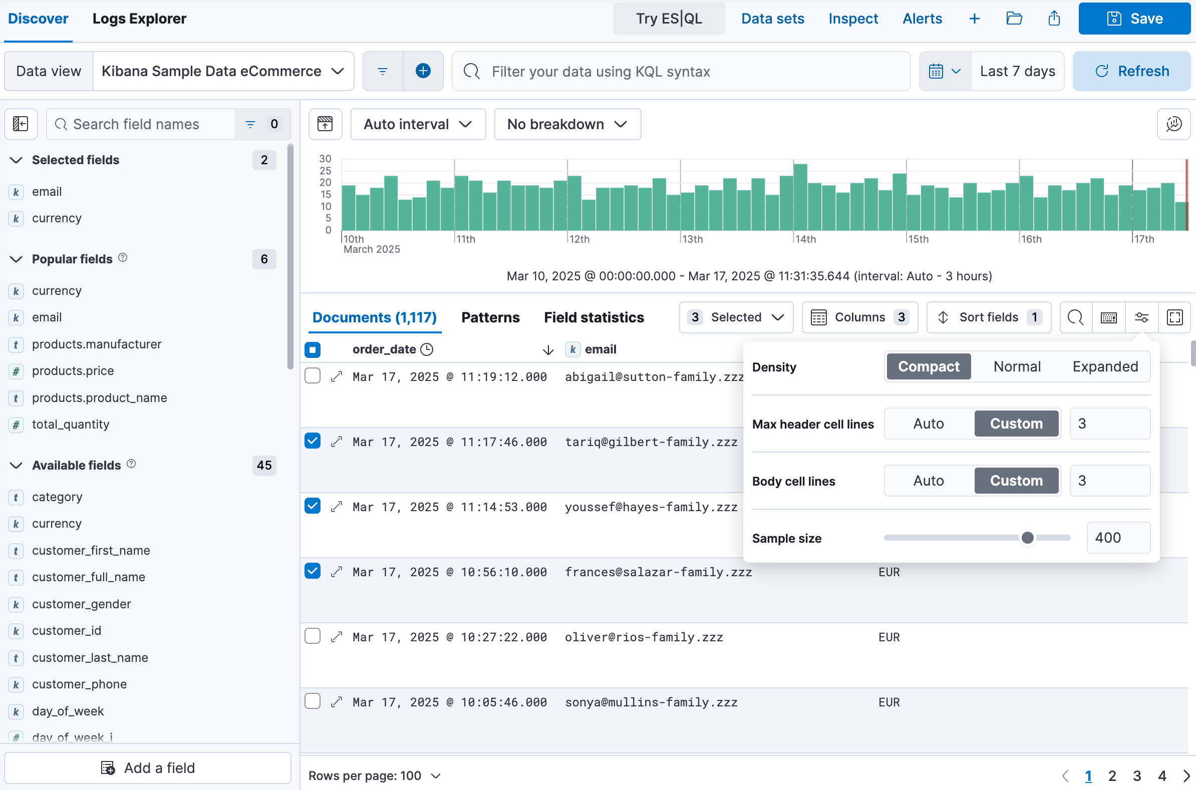 editWhen the number of results returned by your search query (displayed at the top of the Documents or Results tab) is greater than the value of discover:sampleSize, the number of results displayed in the table is limited to the configured value by default. You can adjust the initial sample size for searches to any number between 10 and discover:sampleSize from the Display options located in the table toolbar.