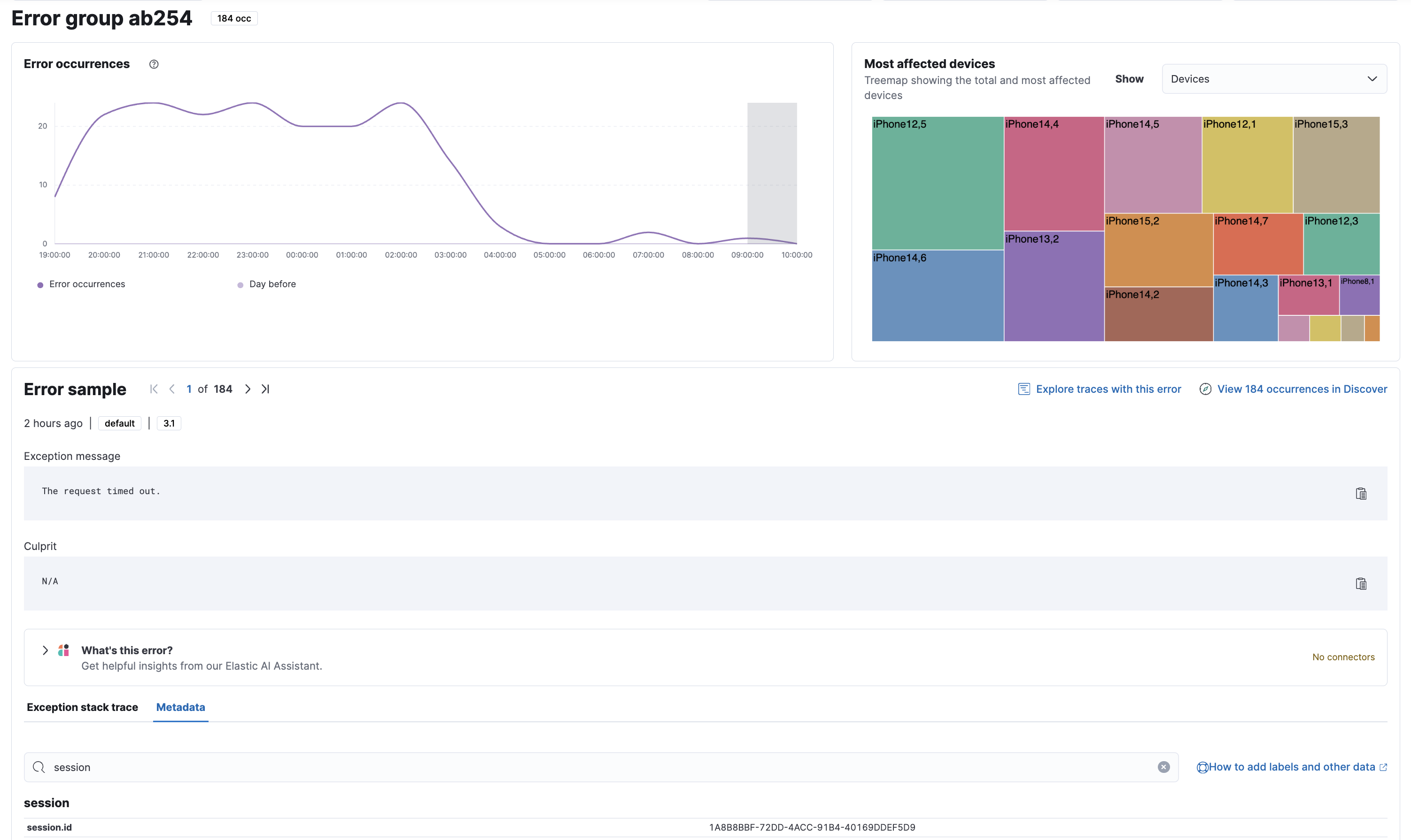 Here we can see the session.id guid in the metadata viewer in the error detail view: