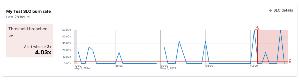 editSLO burn rate breaches occur when the percentage of bad events over a specified time period exceeds the threshold set in your SLO burn rate rule. When this happens, you are at risk of exhausting your error budget and violating your SLO.
