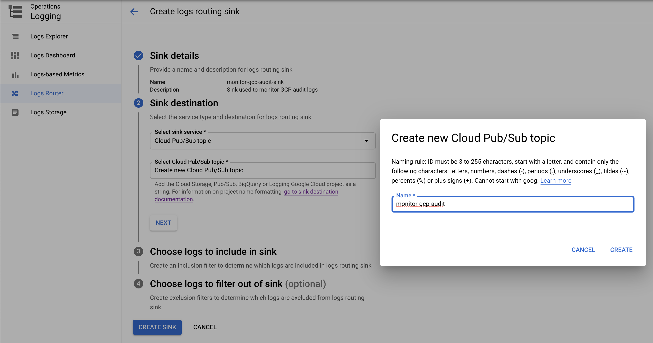 monitor-gcp-audit-sink. Select the Cloud Pub/Sub topic as the sink service and Create new Cloud Pub/Sub topic namedmonitor-gcp-audit: