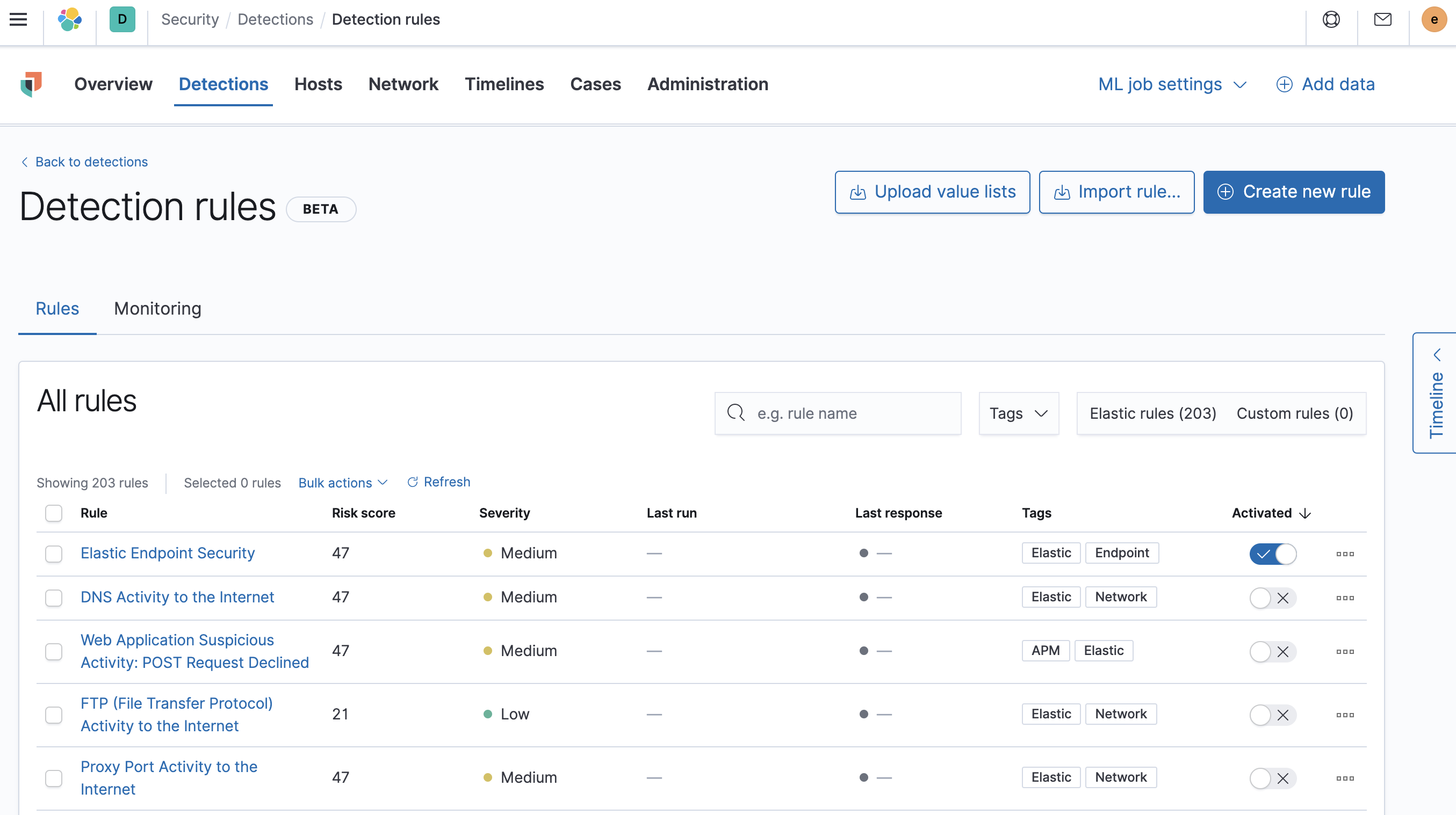 Elastic endpoint exceptions (optional): Adds all Elastic Endpoint Security rule exceptions to this rule (see Rule exceptions and value lists).