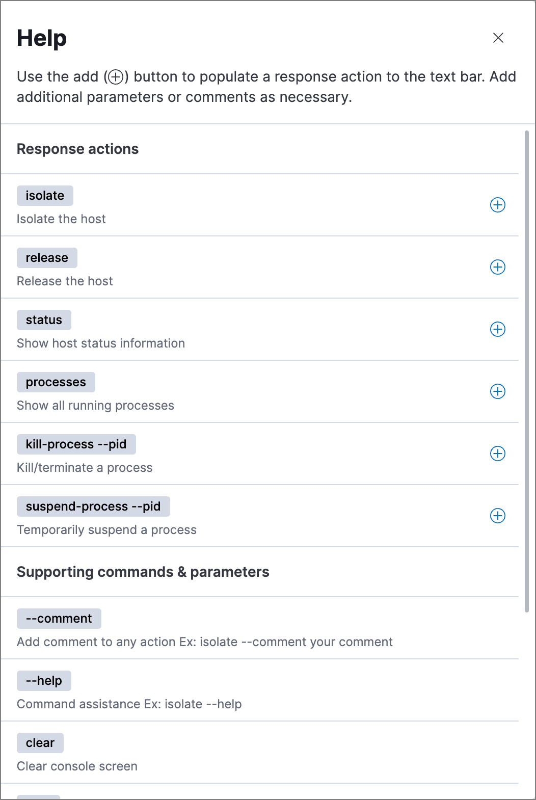 editThe response console allows you to perform response actions on an endpoint using a terminal-like interface. You can enter action commands and get near-instant feedback on them. Actions are also recorded in the endpoint’s actions log for reference.