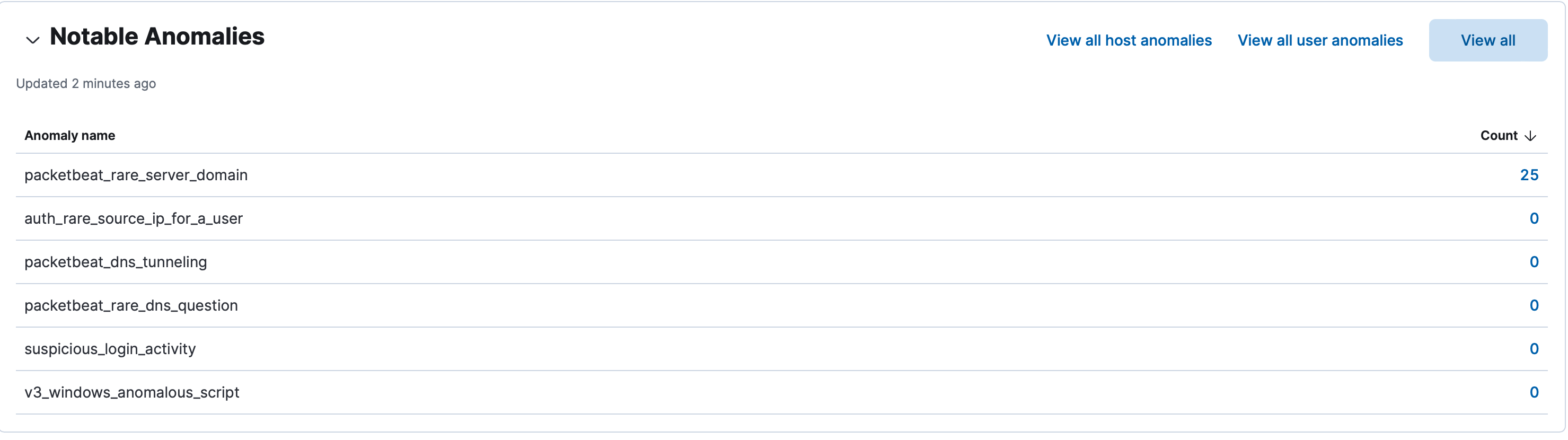 editAnomalies identify suspicious or irregular behavior patterns. The Notable Anomalies table displays the total number of host and user anomalies identified by six predefined machine learning jobs (named in the Anomaly name column). These jobs must be installed and running to provide anomaly data.