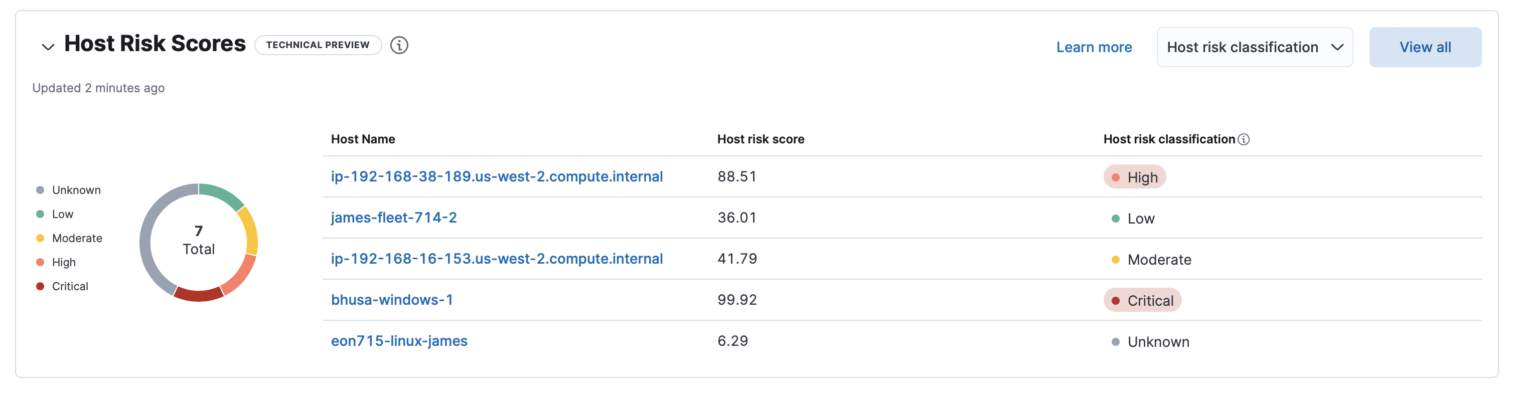 editDisplays host risk score data for your environment, including the total number of hosts, and the five most recently recorded host risk scores, with their associated host names and risk classifications. Host risk scores are calculated using a weighted sum on a scale of 0 (lowest) to 100 (highest).
