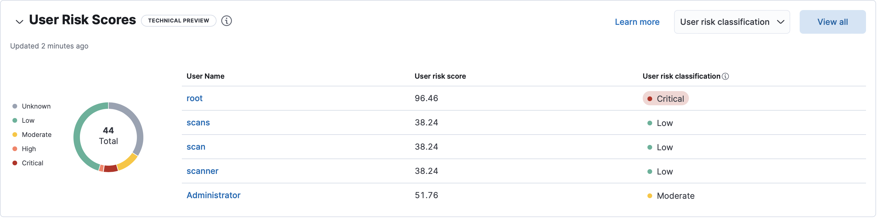 editDisplays user risk score data for your environment, including the total number of users, and the five most recently recorded user risk scores, with their associated user names and risk classifications. Like host risk scores, user risk scores are calculated using a weighted sum on a scale of 0 (lowest) to 100 (highest).