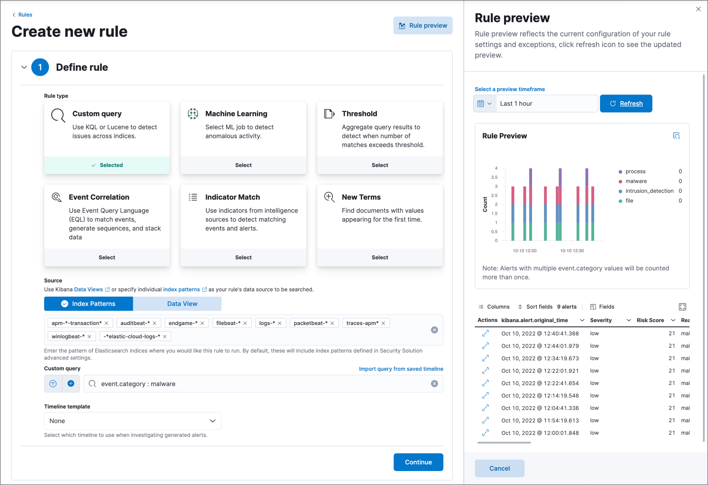Custom query: The query and filters used to retrieve the required results from the Elastic Security event indices. For example, if you want to match documents that only contain a