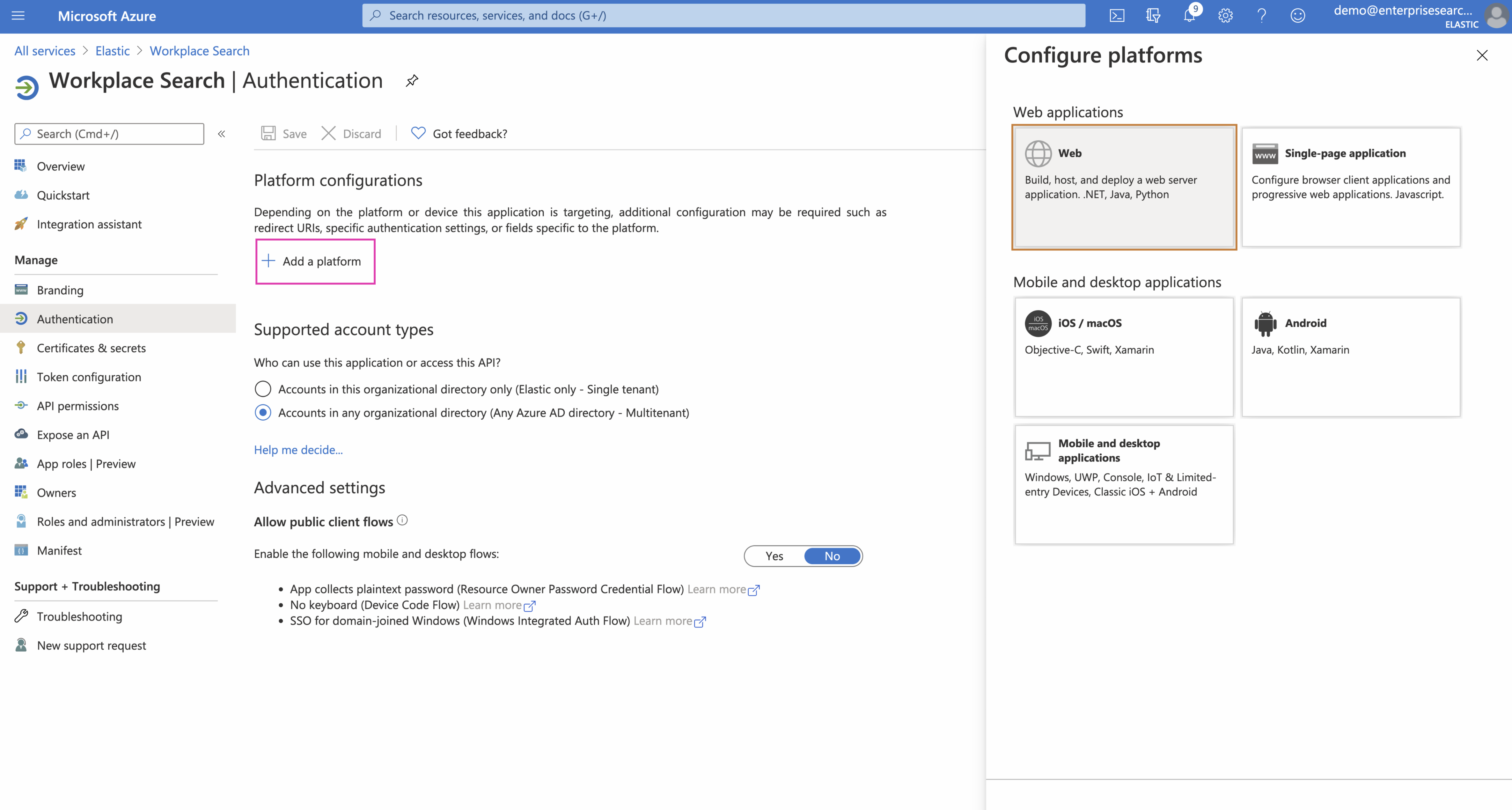 When using standalone Enterprise Search, add the following two redirect URIs, substituting <WS_BASE_URL> with the base URL at which Workplace Search is hosted (scheme + host, no path).